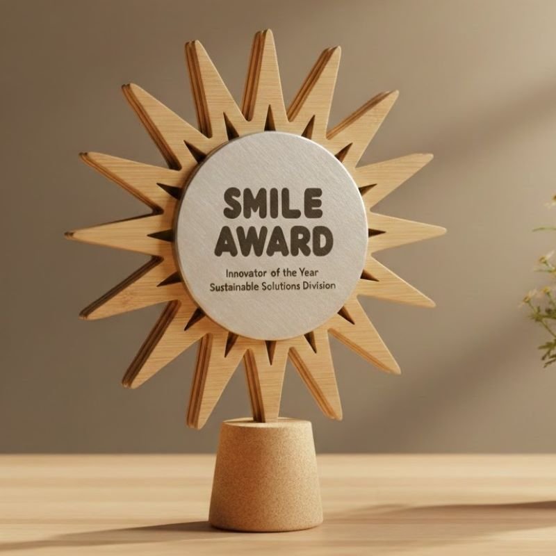 Our Best Smile Award is built using rapidly renewable hardwoods and recycled metals. By choosing FSC-certified maple, we ensure that the wood used in your award supports responsible forestry that protects wildlife and water quality. The metallic accents are forged from post-consumer recycled aluminum, which saves $95\%$ of the energy required to produce virgin metal. This combination ensures the award is as kind to the Earth as the recipient is to their colleagues.