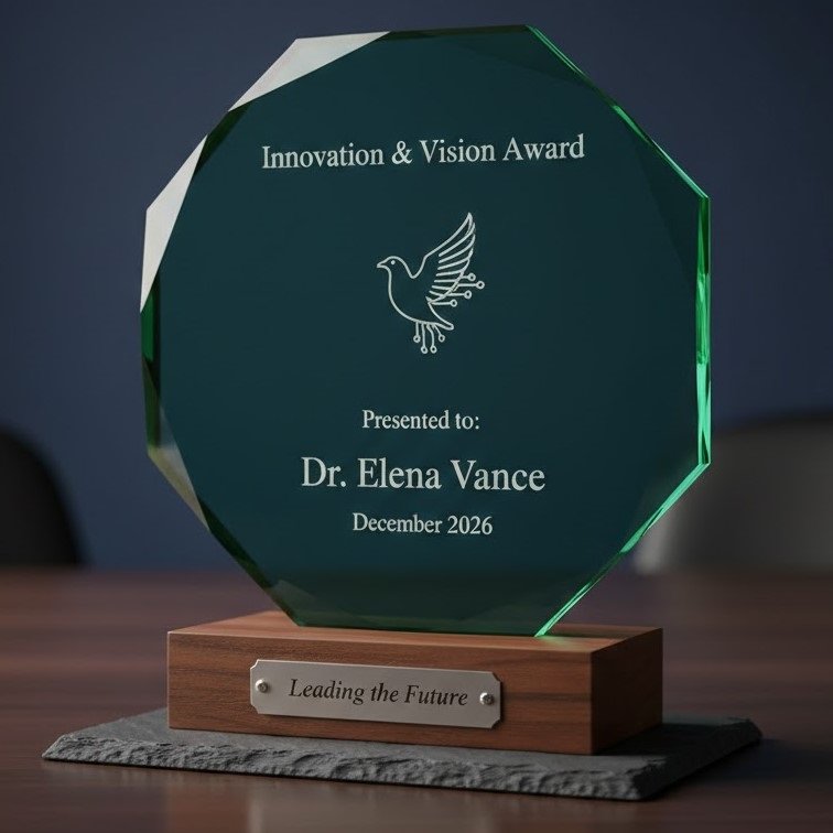 The Custom Dedication Award is specifically designed to honor the “quiet giants” of your organization—those whose steady commitment forms the backbone of your success. The fusion of renewable bamboo and high-clarity recycled glass represents the blend of traditional values and forward-thinking progress.
